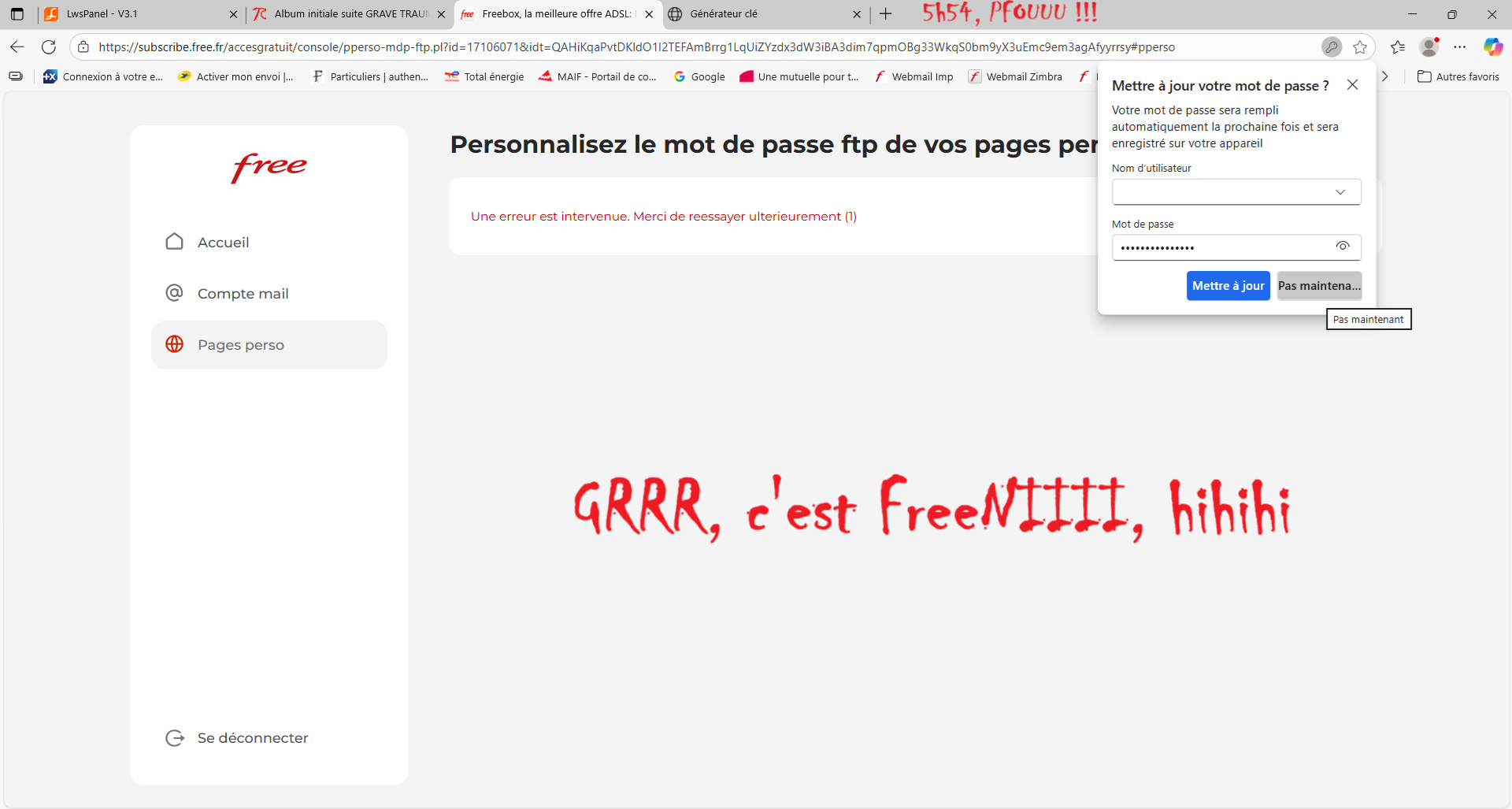 Cette page passera sur ce site créé en 2012 bien entendu, mais comme vous le verrez facielement impossible de faire du FTP pour le moment... J'ai bien entendu de nouveau eu une coupure de sommeil et c'était à 2h37 cette fois, bon j'en profite pour rattraper le retard (aujourd'hui le 12 ocotbre) et SIESTE GARANTIE !!!!